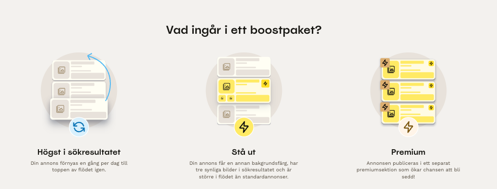 Du har också möjlighet att lägga till boost för din annons. Nedan ser du hur de olika boost-paketen är utformade och vad de kostar: